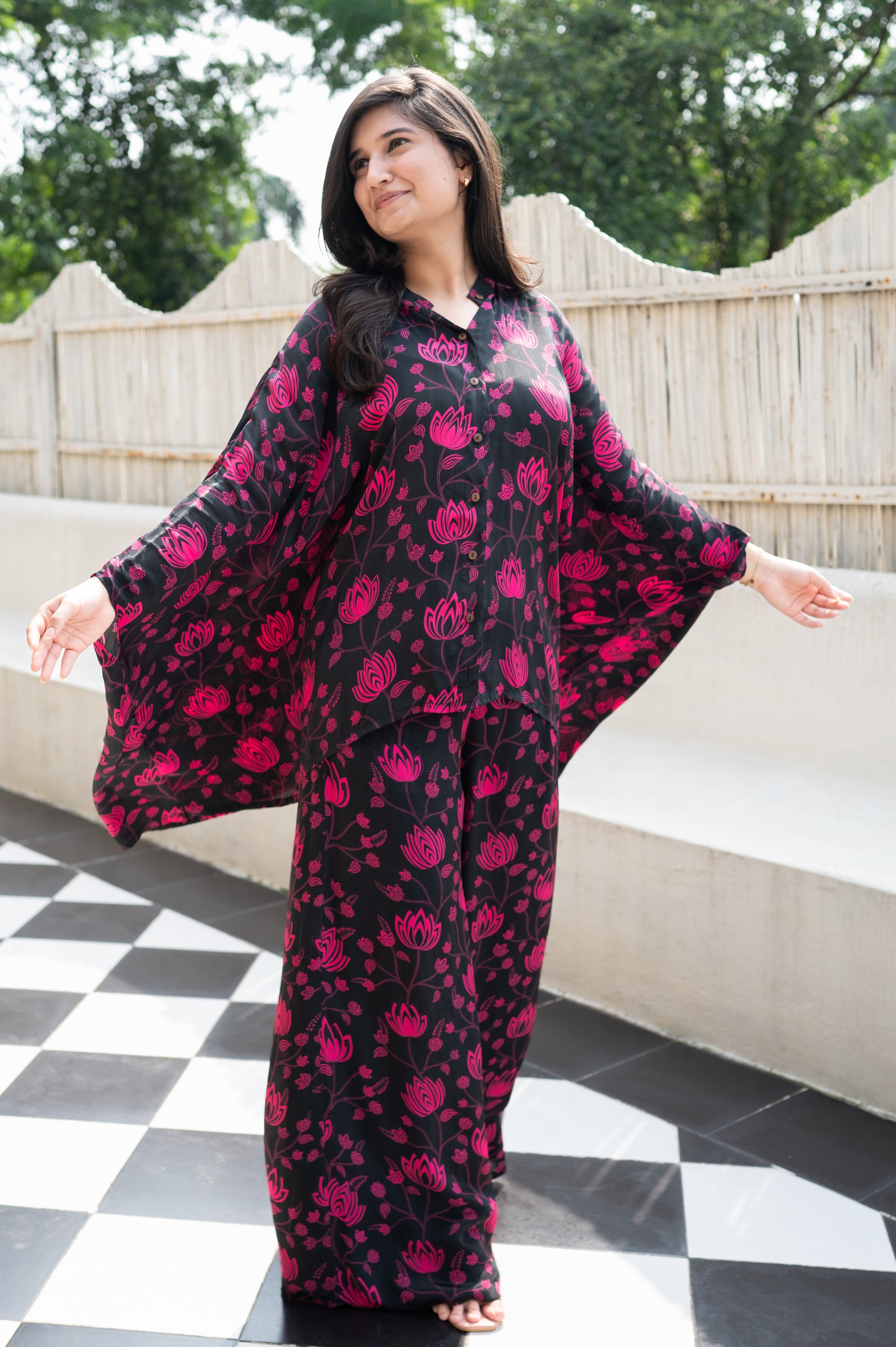 This Black & Pink Lotus Printed Batwing Sleeve Top effortlessly transitions from day to night. The versatile piece can be styled in multiple ways- with different pants, buttoned down with a crop top and so much more. Crafted from Natural Crepe, this set ensures comfort with styles, making sure you enjoy your time hassle-free!