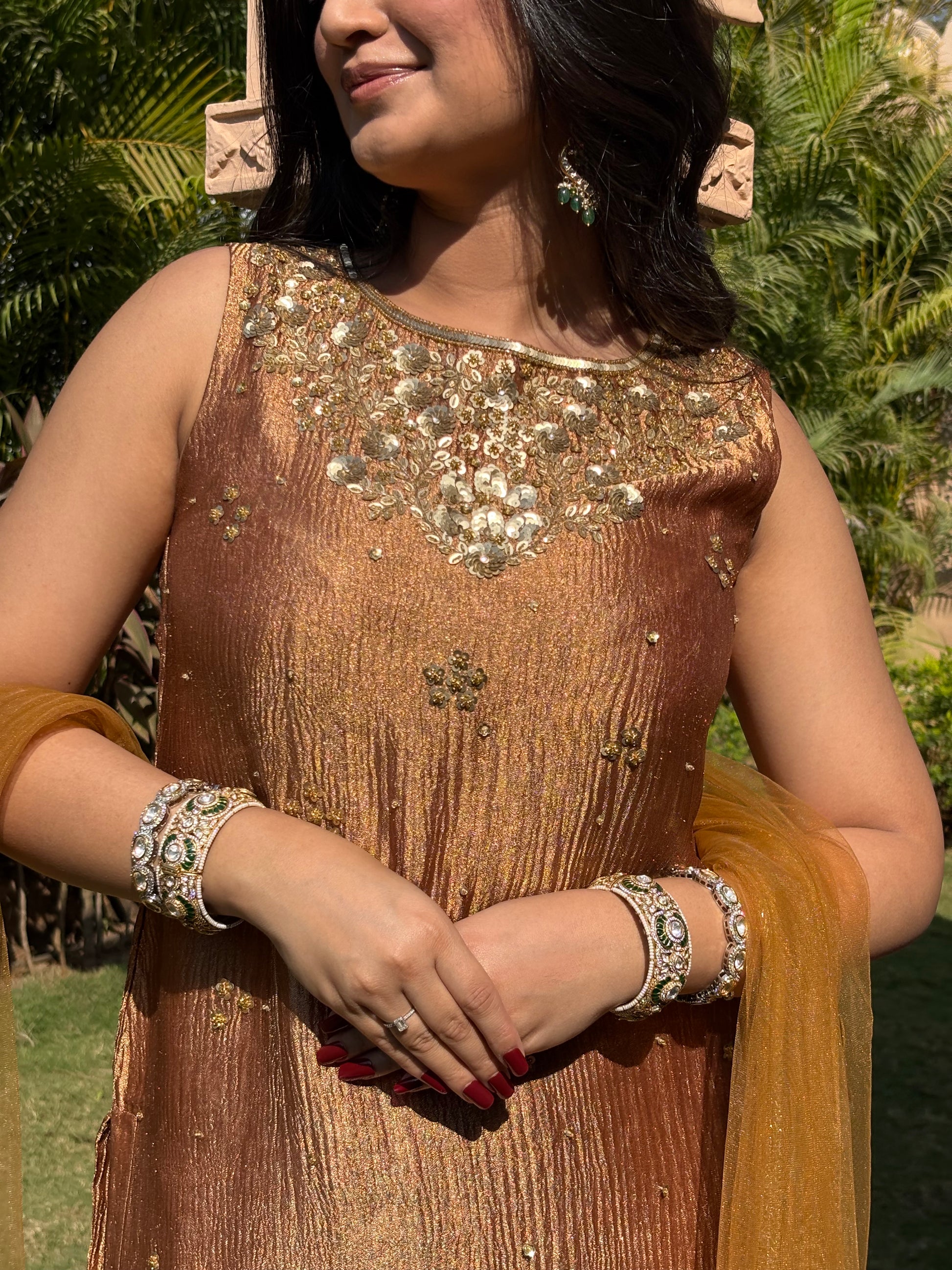 Our Brown Crushed Tissue Silk Sharara Set includes a kurta, a sharara, and a dupatta. The kurta is intricately hand-embroidered with golden glass beads, sequins, and kundan. The sharara is made in 12 Kalis and features mirror details along the hem. Crafted from luxurious crushed tissue, the sharara set is completed with a net dupatta with golden glass beads on the borders. A perfect pick for bridesmaids and any festivities!