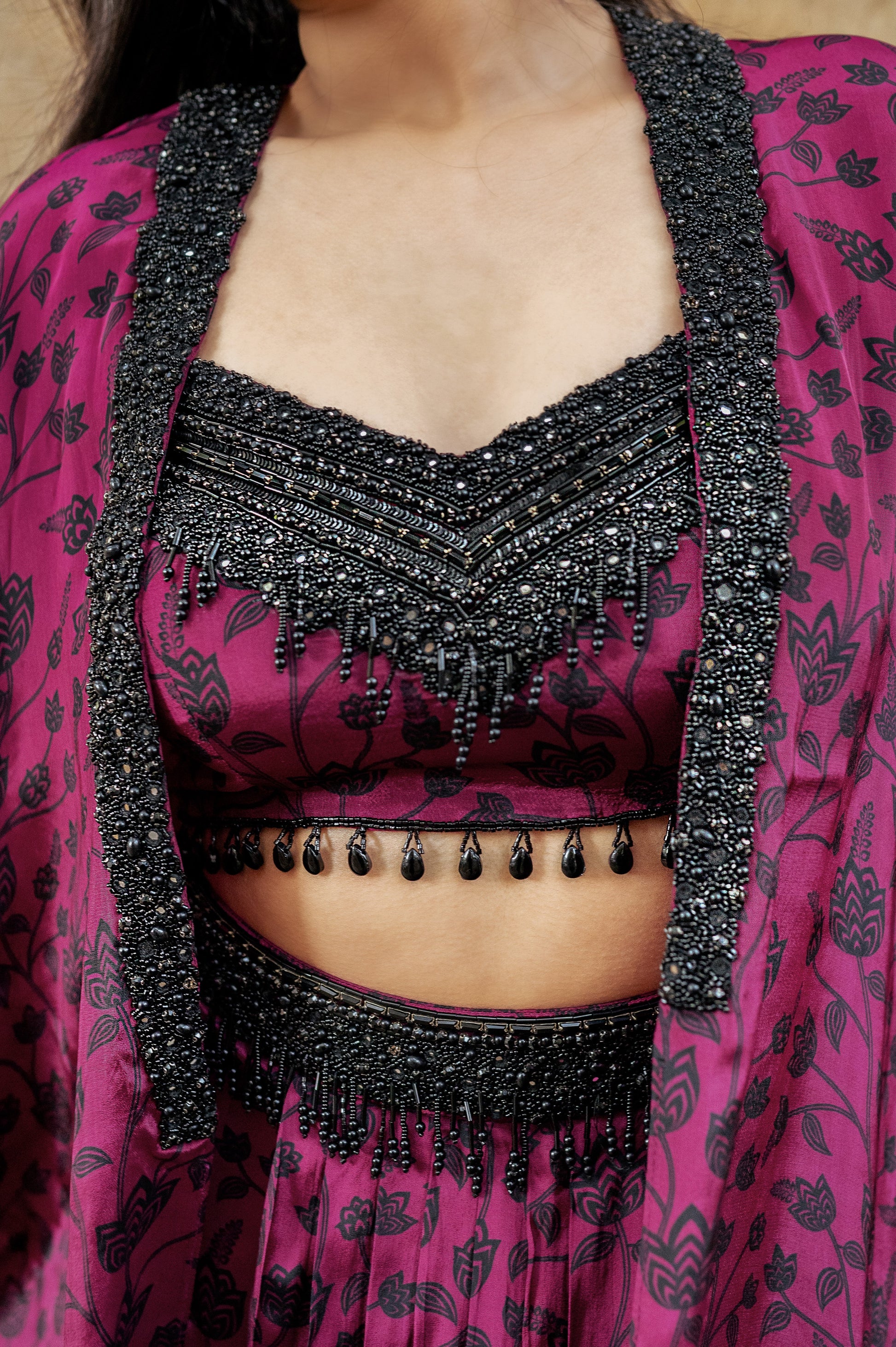 This set is made in a floral berry-colored print on natural crepe. It captures the essence of the cocktail and sangeet ceremonies. The set includes a pleated skirt that beautifully hugs your body, a blouse, and a cape. The skirt belt, blouse and the cape have been hand-embroidered with black stones, glassbeads and mirrors to contrast with the print.
