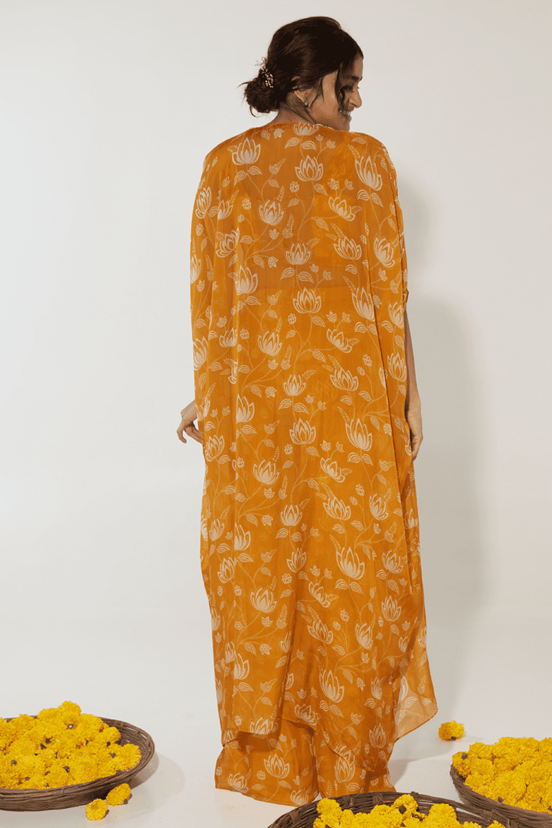 This set is perfect for a Haldi ceremony and festivals. It includes a pant, a blouse, and a cape. The blouse has been hand-pleated and its belt and cape borders have been hand-embroidered with pearls, white glass beads, resham, and mirrors.Â