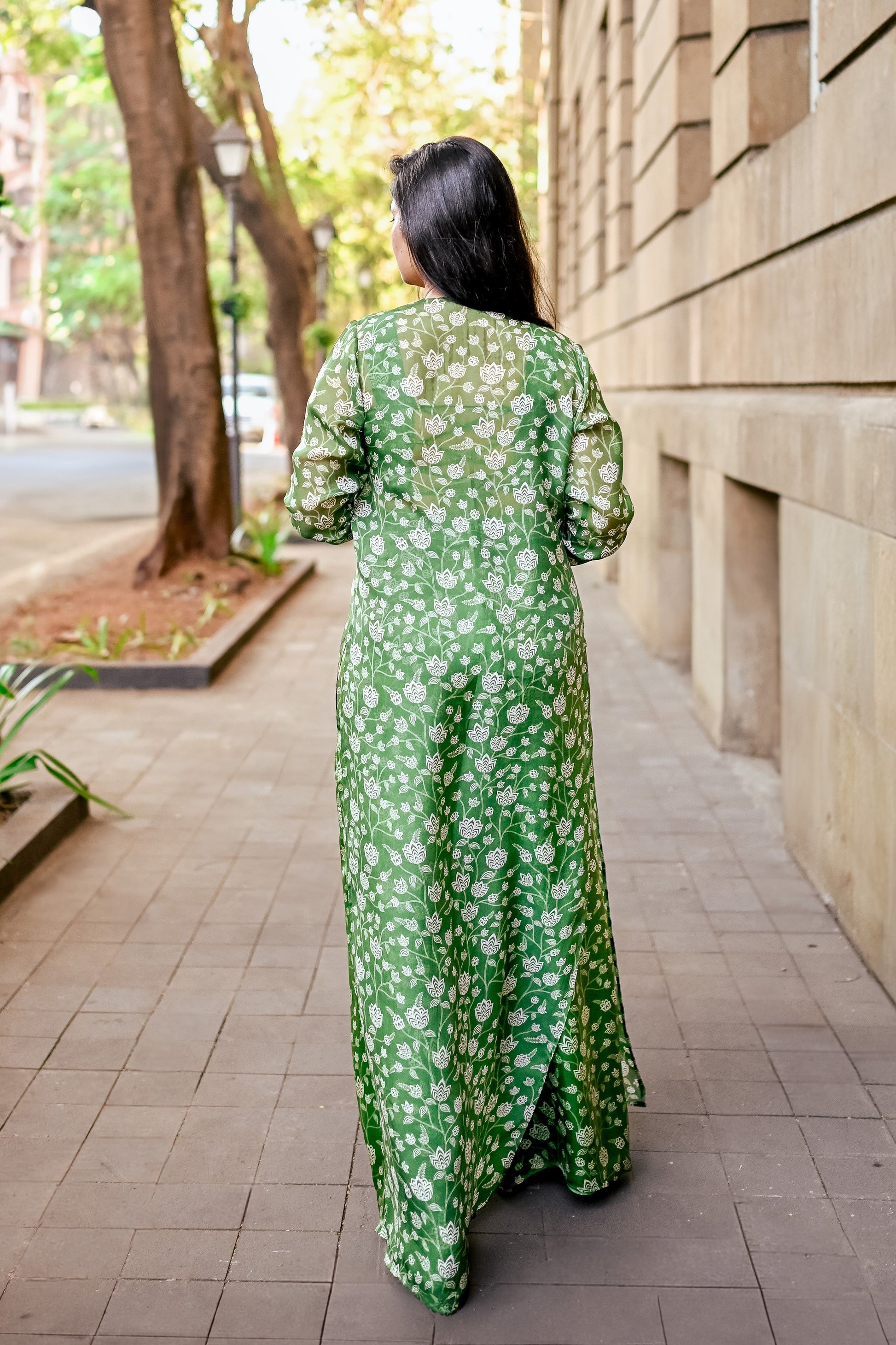 This is the perfect bridesmaid set for a Mehendi Ceremony. Made in a Floral Olive Green Print, the top and pants have been Hand-Pleated in Organza Satin. The jacket is made of Organza in the same print. It has been hand-embroidered with pearls, mirrors, and glass beads.