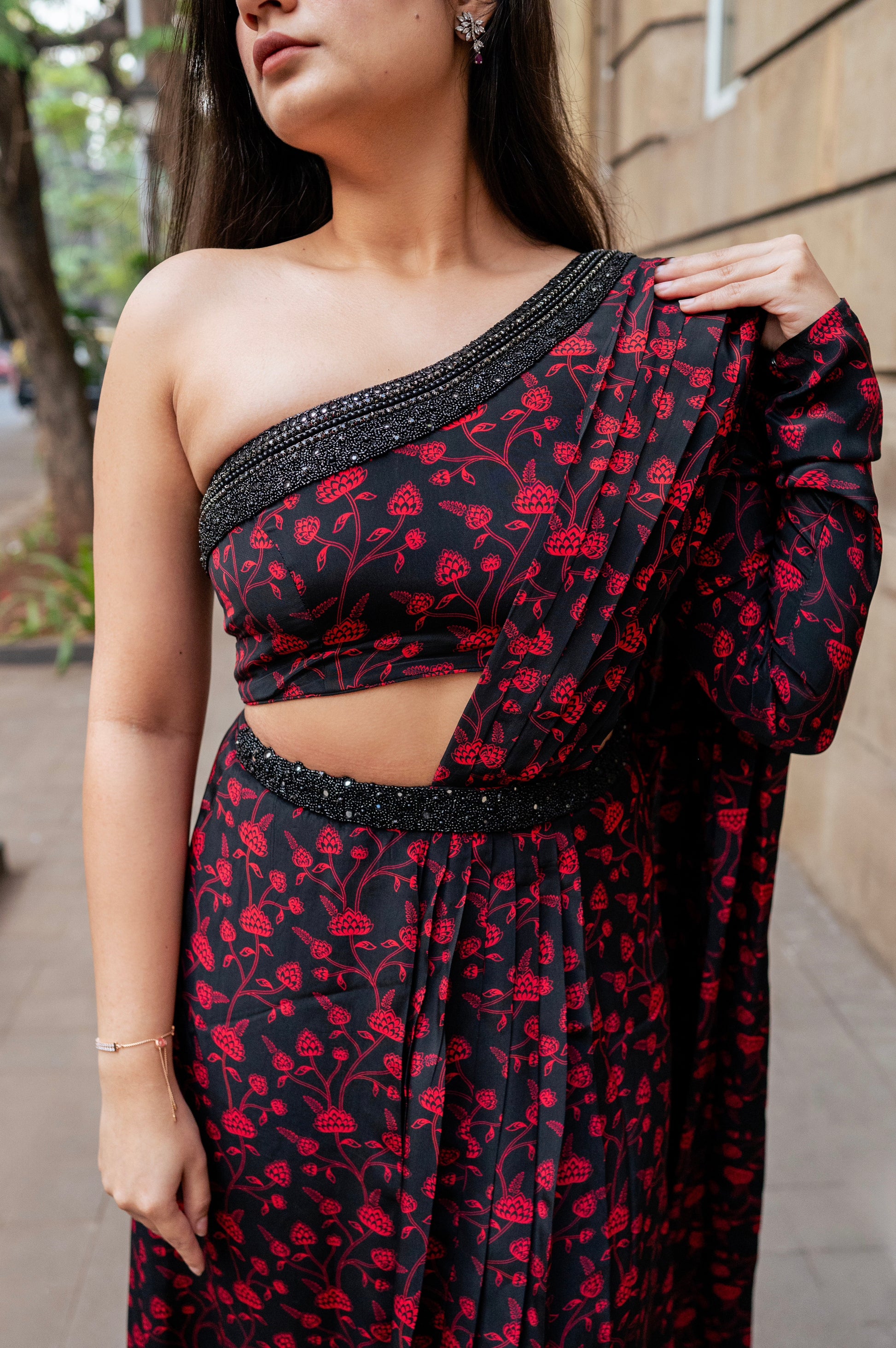 This set captures the essence of the cocktail and sangeet ceremonies. It includes a pre-stitched and pleated saree with a one-shoulder blouse. The blouse and skirt belt have been hand-embroidered with mirrors and glass beads. It is made in a floral black and red print on Natural Crepe.