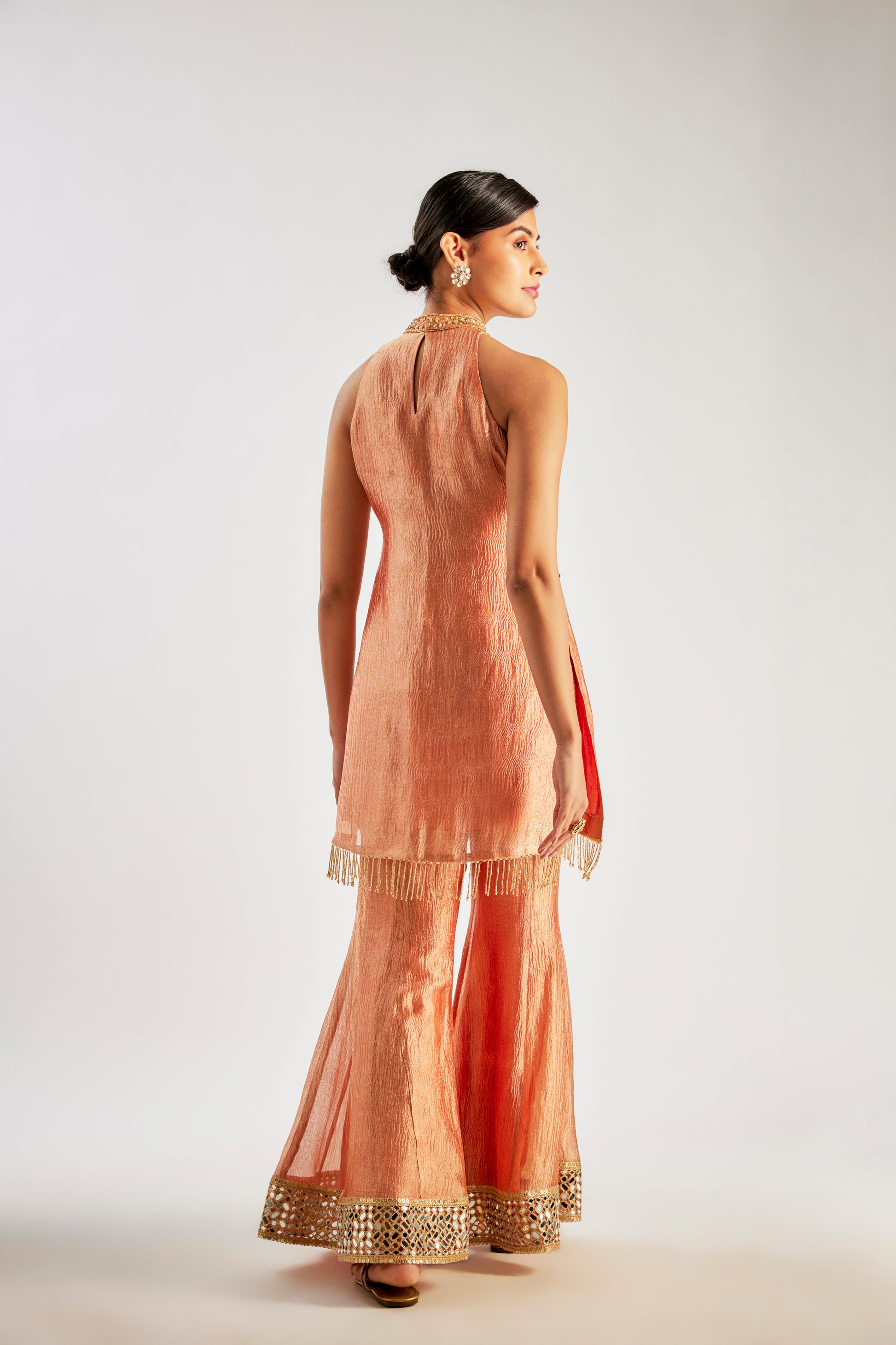 Our Rust Orange Crushed Tissue Silk Sharara Set includes a kurta, a sharara, and a dupatta. This Halter-Neck kurta is intricately hand-embroidered with golden glass beads, sequins, and kundan. The sharara is made in 12 Kalis and features mirror details along the hem. Crafted from luxurious crushed tissue, the sharara set is completed with a net dupatta with golden glass beads on the borders. A perfect pick for bridesmaids and any festivities!