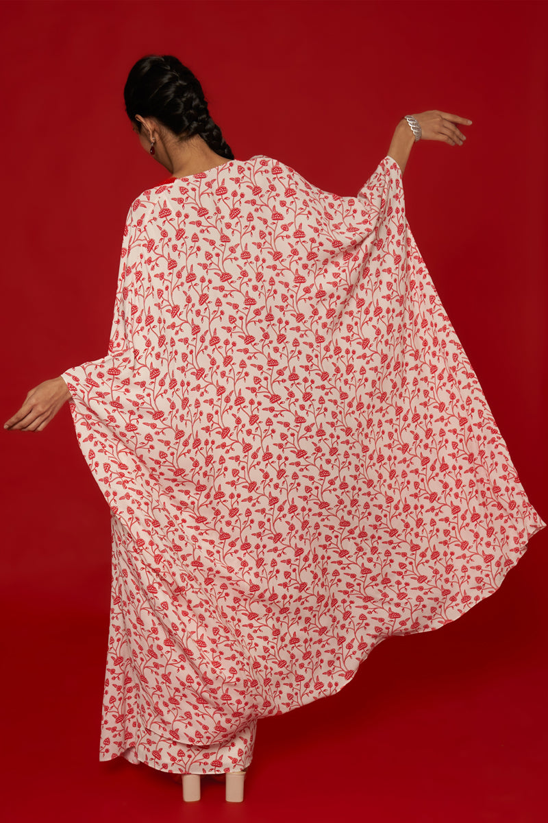 This White and Red Floral Printed Cape Set  comes in a set of a blouse, a draped and pleated skirt, and a cape. Its neckline, belt, and cape borders have been hand-embroidered in the contrasting shade of red, using glass beads, wooden beads, resham, and mirrors. The embroidery on the blouse is further enhanced with tiny red fringes.
