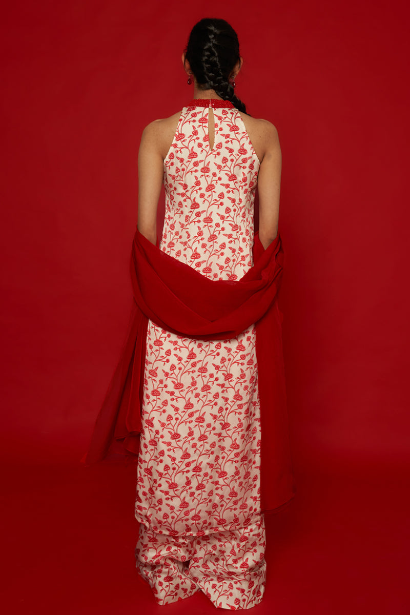 This White and Red Floral Printed Kurta Set has a halter neck that has been hand-embroidered in the contrasting shade of red, using glass beads, wooden beads, resham, and mirrors. The set is completed with a pair of matching palazzos and a contrasting red organza dupatta.